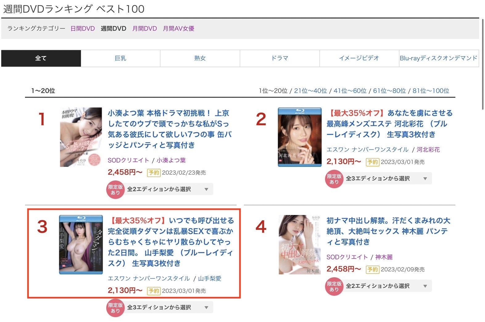 好消息是这次山手梨爱的反应比较明显了,但身材方面明显比过去更加夸张了,肋骨都跑出来了然后胸部还变更大真的不合常理,也难怪这次她衣服穿得很多ー不过话说回来,即使不只是我觉得山手梨爱身材更加夸张,但数字会说话,你看看这支抖M的企划买气如何ー