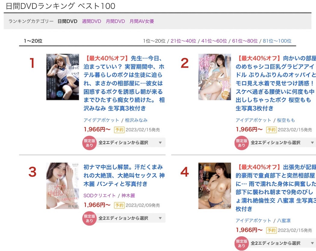 据FANZA内部的人说有可能是有人利用订货完退货然后再订货再退货这样的循环替相沢みなみ(相泽南)冲榜,但玩这套人最后还是没有买片所以相沢只有在日间榜很强,到了月间榜就回归正常,虽然还是蛮优秀的但不是最优秀ー如果真如对方所言,那我真的希望爱她就是支持她,与其玩这种游戏让相沢开心,不如实质照顾她让她不论什么榜都能立于榜首,对吧?