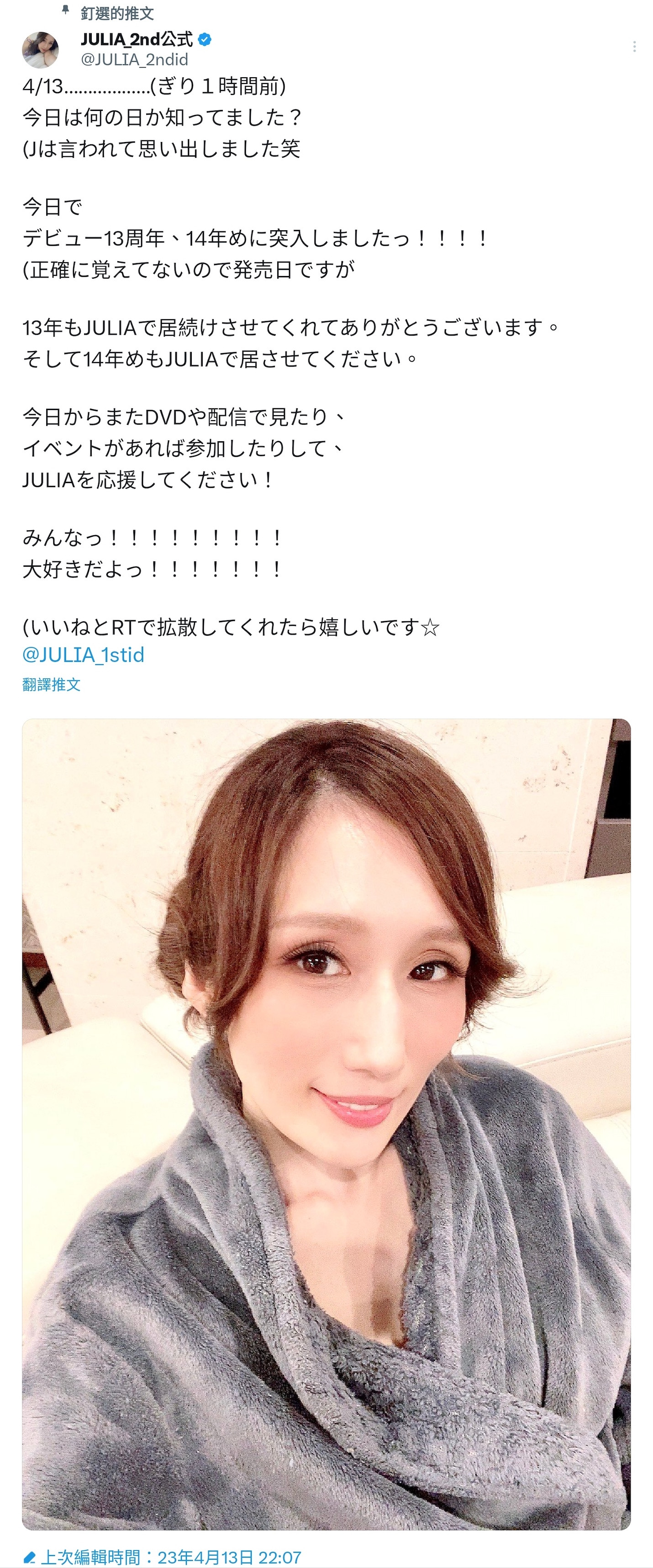 是的,13年前的4月13日,Julia以「B100 W55 H84 DEBUT JULIA!!!」这支作品正式加入AV界,大家还记得当初片商E-Body是怎么打造这位专属女优吗?其实和现在很像,除了强调Julia有着超越想像的Super Body外就是在预告片中尽量避免让她露出庐山真面目⋯