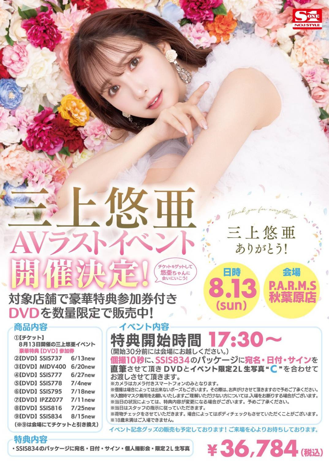 除了参加券之外还强迫购买SSIS-737、MIDV-400、SSIS-777以及SSIS-778四支作品,摄影会不得录影,结束后可以和三上击掌,最后还可以拿到活动限定生写真「A」,售价18,392日币(约台币4,100元)。