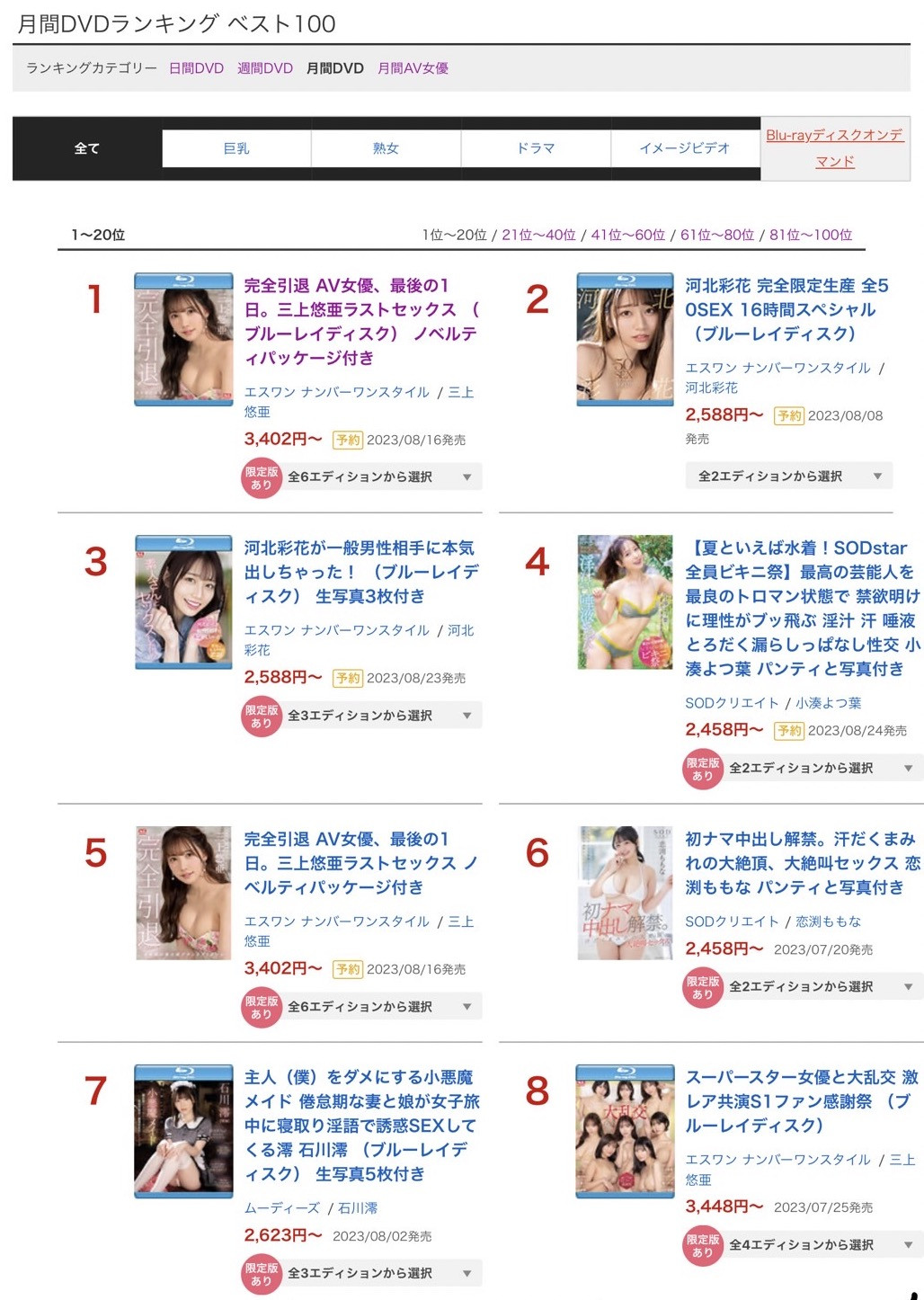 最后的引退作排第一和第五、大乱交排第8和第13(因为作品有DVD版和蓝光版的差别),三上的引退确实是大事ー身为业者,就算对女优有所好恶,我还是会以她们的市场价值来判断是否合作,所以明知道有些朋友觉得三上没那么漂亮也不认同她是业界的天后但我还是要说她就是天下第一人,完全值得片商花那么多力气推出她的引退企划,因为她值得〜