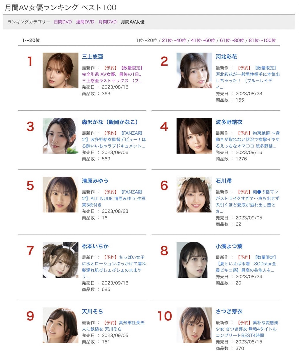 新作排在第3也就算了,河北彩花可怕的是精选辑拿下第2,要不是碰到三上必须拿下第一的引退作,河北彩花很有可能会用一支精辑打趴大家;接下来就是SOD STAR的全员比基尼祭了,其实上个月SOD Star的成绩不错,小凑よつ叶(小凑四叶)禁欲和吉村卓的千日战争拿下第4,神木丽和恋渕ももな(恋渊桃菜)的共演杀进前10名,再加上不属比基尼祭的恋渕ももな(恋渊桃菜)中出し解禁冲到第6,虽然三上和河北真的太强了,但现在正是养出新一代四小天后的SOD STAR最强的时代,如果可以的话请马赛克打薄一点,让大家可以看得更兴奋一点,谢谢。