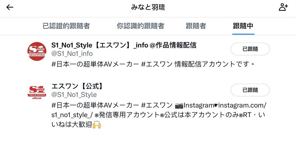 一块儿来看看片商S1的K奶新人「みなと羽琉(凑羽琉)」,一般来说要确认女优的事务所先看两个地方,一个是她们的自我介绍栏一个则是她们追踪的对象,「照理来说」都可以找到女优的经纪公司ー但偏偏みなと羽琉(凑羽琉)就是非典型女优,自我介绍栏她一个字都没写,追踪也只有两个和片商有关的帐号: