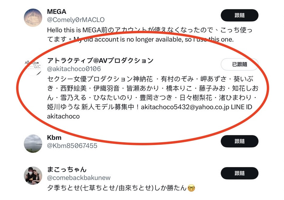 所以我们就查不出みなと羽琉(凑羽琉)的事务所了?没喔,还有第三个方法,那就是看是谁转推了女优的发文:虽然不同事务所的经纪人可以当朋友,但转推女优发文这种事只有自己人才会做(简单说就是C-More的经纪人只会转推C-More女优的发文,其他女优就算有交情也不会在社群上转推发文),所以简单查一下转推みなと羽琉(凑羽琉)发文的名单,你会看到这间经纪公司:
