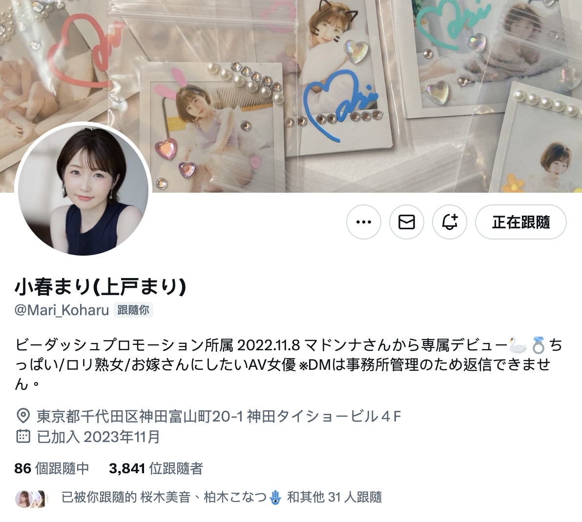 让我们来复习一下女优更换事务所会碰到的状况,首先就是艺名能不能保留?天底下没有自己的员工被挖走会爽的,所以女优如果要保留原有的艺名是非常不容易的(而且常常要付出让前东家抽成的代价),如果女优和原事务所的关系不错,那通常可以保留艺名的一部分,所以这位女优从上戸变小春然后都叫まり(真理)算是好事一件;再来,更改了事务所也要看社群能不能延续使用,上戸まり(上户真理)已经说了,原先将近五万人的X(twitter)将会删除,请大家去追踪她新的X(https://twitter.com/Mari_Koharu):