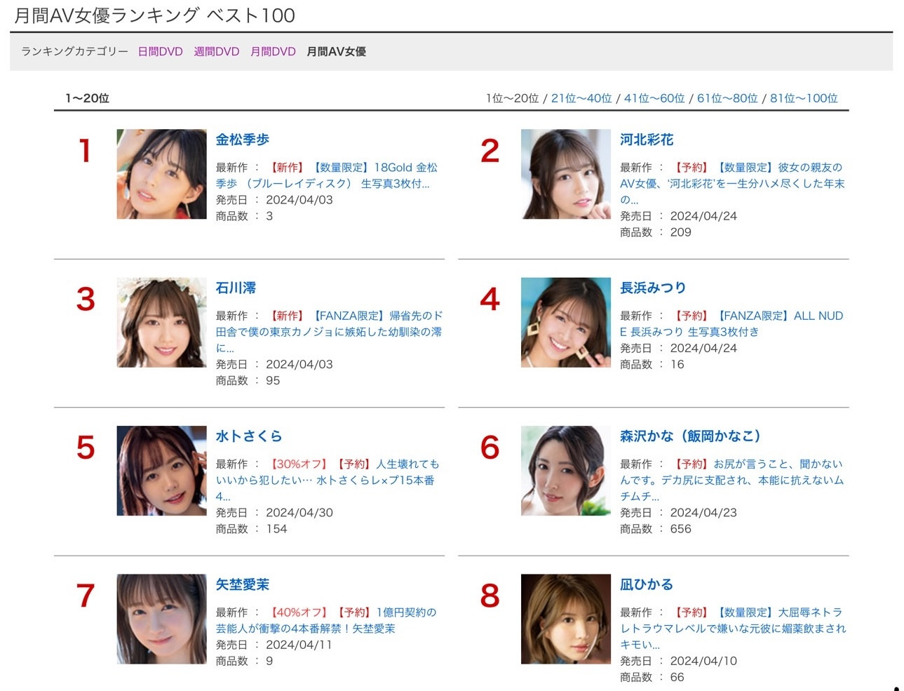 然后长浜的写真作品「ALL NUDE」还拿下了第六,从出道以来她真的是气势无法挡,就连艺能人也不见得是她的对手ー没错,在长浜之下的就是SOD STAR艺能人女优「矢野爱茉」的新作1亿円契约の芸能人が冲撃の4本番解禁!:虽然第2支作品就输给了长浜みつり(长滨蜜璃)难免会被觉得退烧有点快,不过作品销售这块能讨论的事情很多,包括矢野的主场并不是在FANZA、包括作品打折的%数也会影响影迷购买的意愿,我是觉得还好啦,现在还不是担心她的时候〜