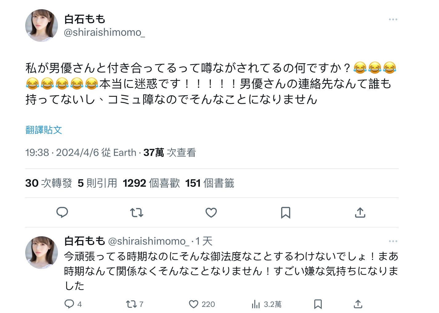 可能会有人觉得男女优谈恋爱也没什么不好,澄清就可以,白石もも(白石桃)干嘛反应这么大?