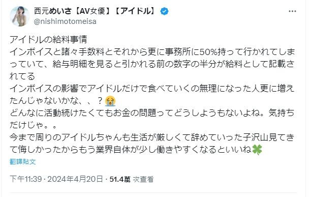 所以很多人猜测,白兎なの(白兔菜乃)就是因为拍过无码的事曝光了才被开除,然后她从此自偶像圈消失ー这就是做偶像辛苦的地方,因为收入太低所以很容易被AV界或是无码卖家捕获,然后地下偶像圈又对这些拍过片子的成员特别严苛一定要赶尽杀绝,于是就出现地下偶像圈都快成了AV界的农场但各经营团队都束手无策只能去一个斩一个的奇妙现象,好不容易出了个西元めいさ(西元明沙)结果谈到偶像的她还是说给薪太低⋯