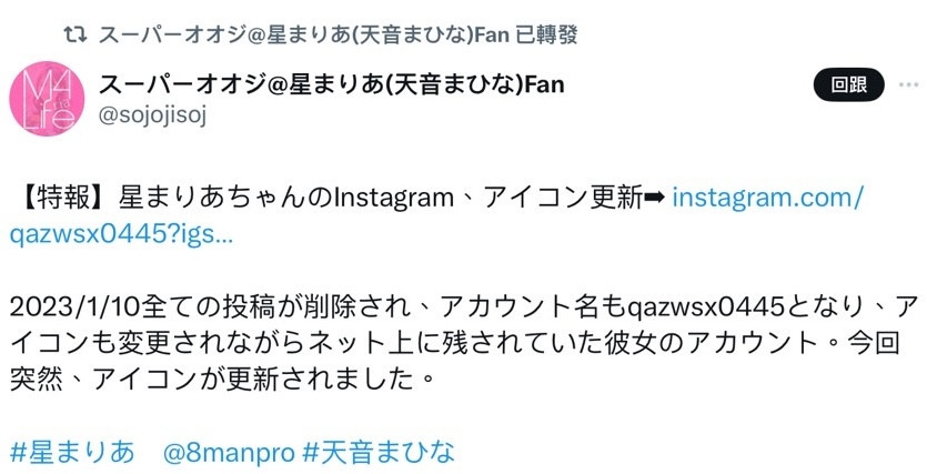 所以X上马上出现了「拜托星まりあ复活」的帐号(https://x.com/sojojisoj),他每天发集气文、标记星まりあ(星麻里亚)之前的经纪公司エイトマン(8MAN),希望能听到好消息: