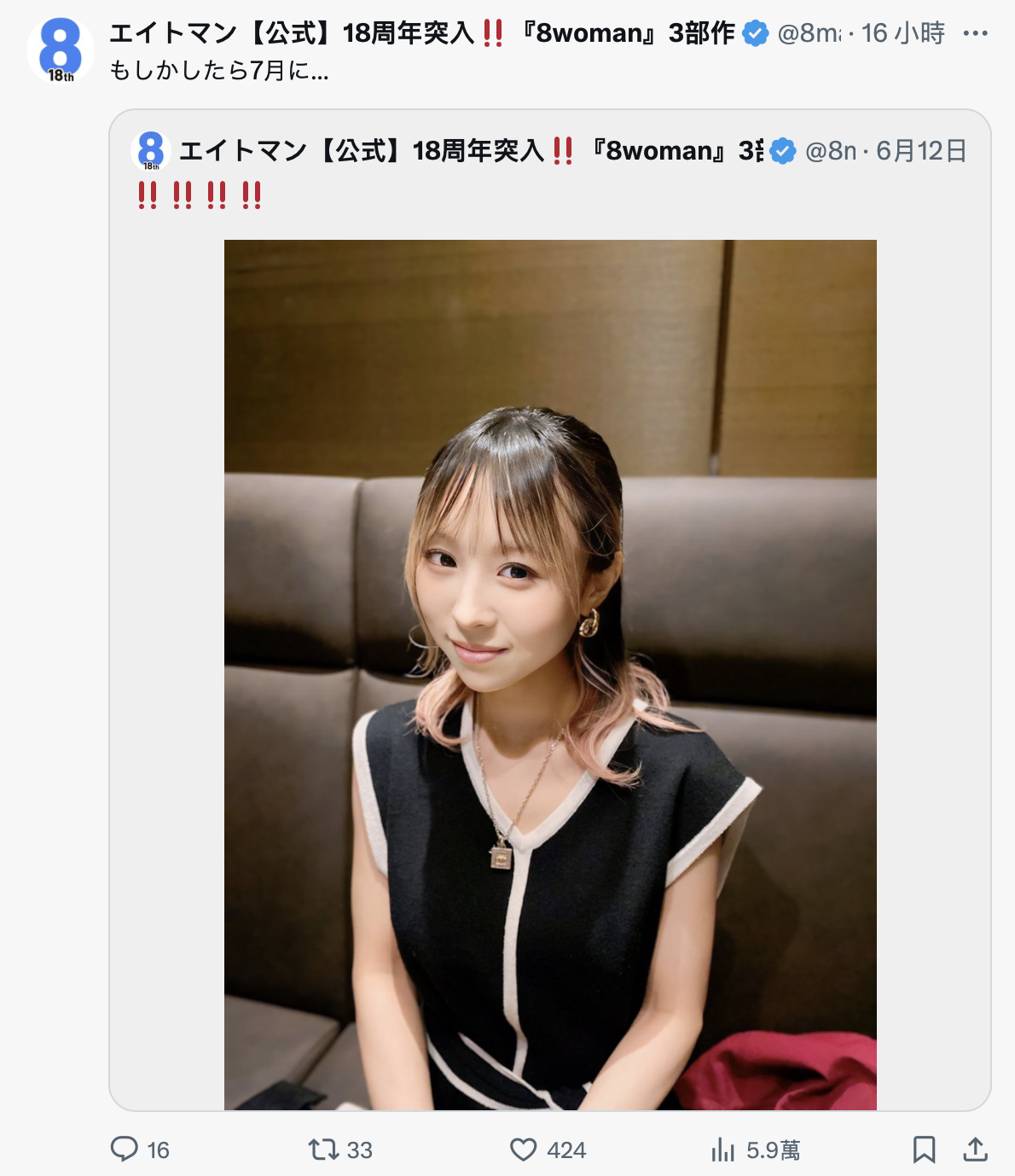 同一张星まりあ(星麻里亚)的照片,经纪公司エイトマン(8MAN)在官方X(https://x.com/8manpro)引用然后加了一句「もしかしたら7月に…(也许是在7月)」你觉得是什么意思?