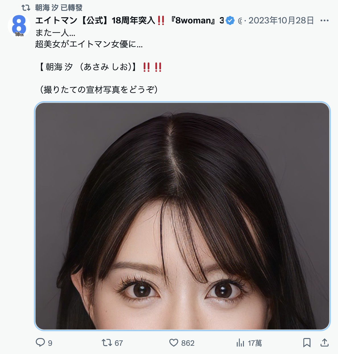 又是海又是汐,感觉这姑娘水很多,她是上个月(2024/6)在X上露面的エイトマン(8MAN)新人,目前在社群上还没有头像,但エイトマン(8MAN)说了,她是超级大美女,然后,即将现出庐山真面目〜