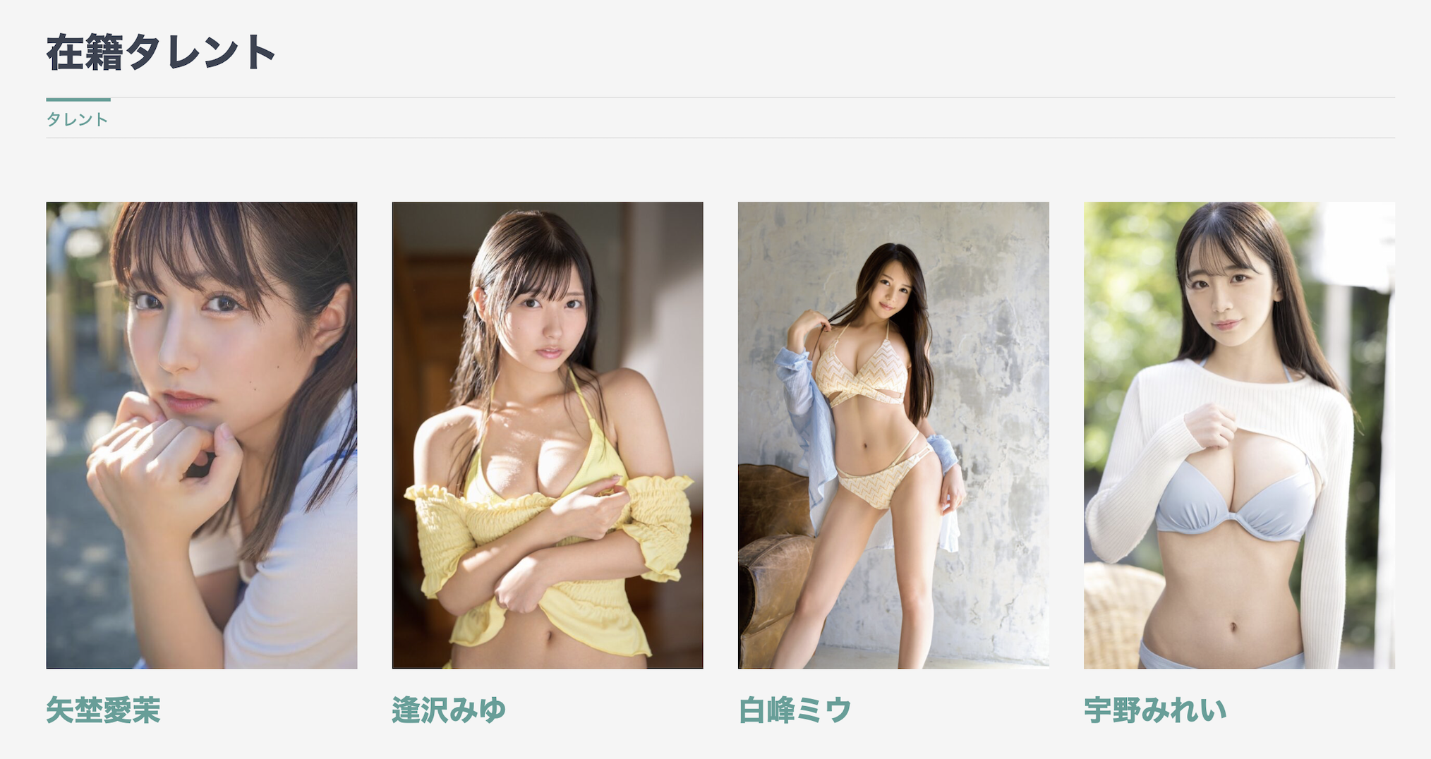 新官网上线自然就要看看女优名单了,曾经强悍、收购另一间事务所Arrows的他们现在女优列表只有11位女优,而且桜もこ(樱萌子)还退休了ー最上面一排四位女优是这间经纪公司的主要战力,排在第一位的是艺能人矢野爱茉,她在SOD STAR拿到的一亿円(2200台币)签约金让这家公司在风雨飘摇中仍然能活下去;接下来的逢沢みゆ(逢泽美优)和宇野みれい(宇野美玲)则都是顶级片商S1的专属女优,外型一流的白峰ミウ(白峰美羽)则是两社共有的专属女优〜