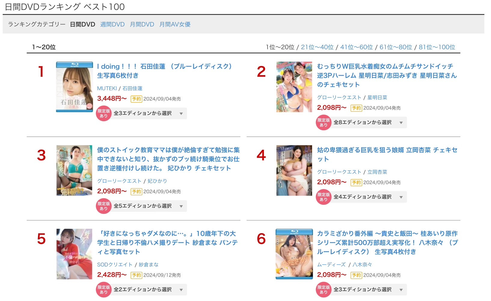 这是昨天的FANZA实体片部门的单日销售排行榜。