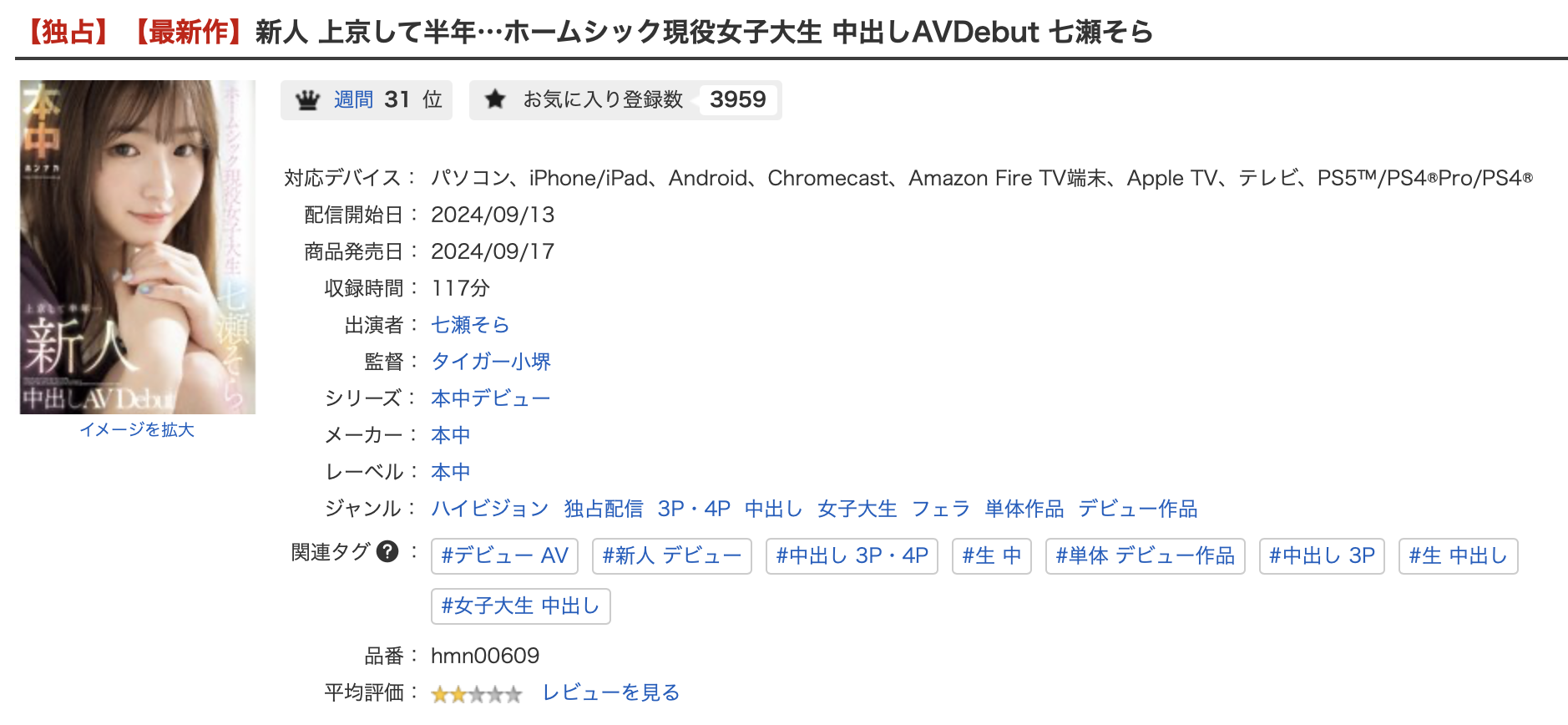 然后再看看作品的销售页面,在FANZA,七瀬そら(七濑空)这支作品目前高居本周串流排行榜的第31名,希望买片回去的朋友都喜欢,不要怒火中烧拳头硬了ー