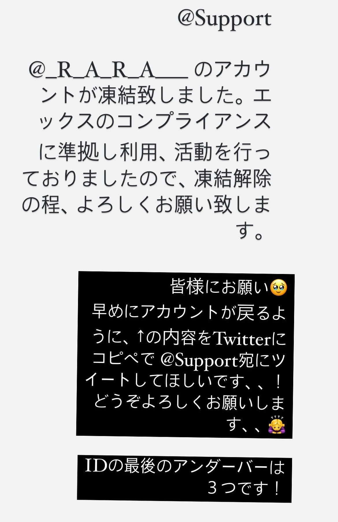 那要怎么办呢? RARA除了改经营IG(https://www.instagram.com/r_a_r_a__a/)外也特别在限动请大家帮忙向X官方反应让她能取回帐号;不过她的IG目前追踪很少还不到3000人,宣传效果还是有限,应该还是会想办法恢复X的帐号〜