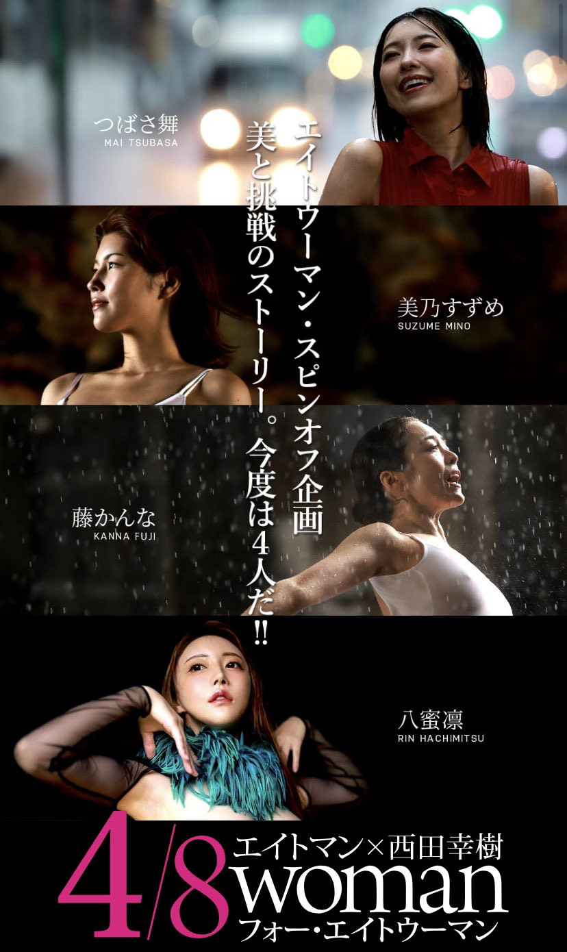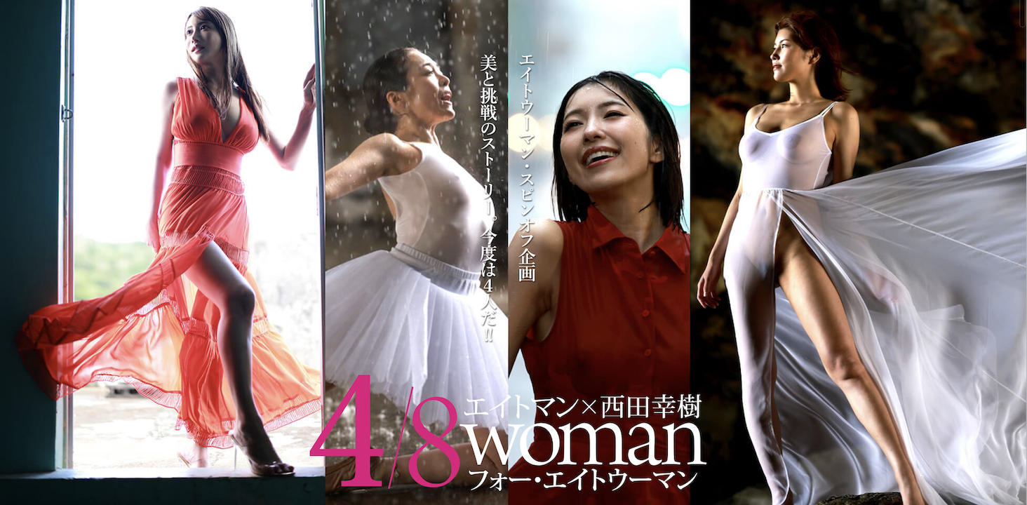 不久前,他们公开了4/8woman的官网,正式宣布年底的超大型写真企划:先是请来合作愉快的摄影师「西田幸树」,然后挤牙膏地一个一个公布合作的女优,她们分别是:
