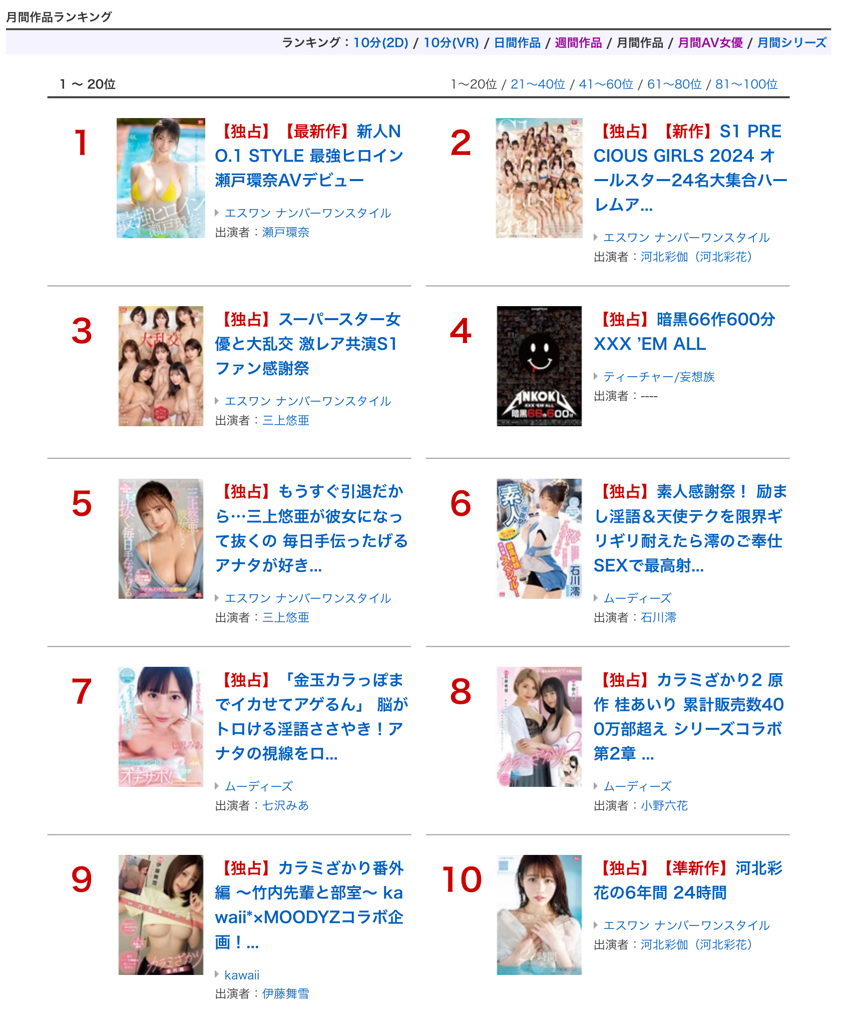 她还是有一个第一,是串流排行榜月间AV女优排行榜冠军,也就是说现在越来越多人没有购买实体片而是在串流平台消费支持她,能在这个排行榜上打败包括美园和花、松本いちか(松本一香)这种发片如流水而且一堆作品在打折的女优真的很不容易,所以千万不要因为瀬戸环奈崛起就觉得河北不行了,她不只是前辈而且基础打得很好,商业合作的案子很多而且价码都不低,天下第一人的位置不容动摇: