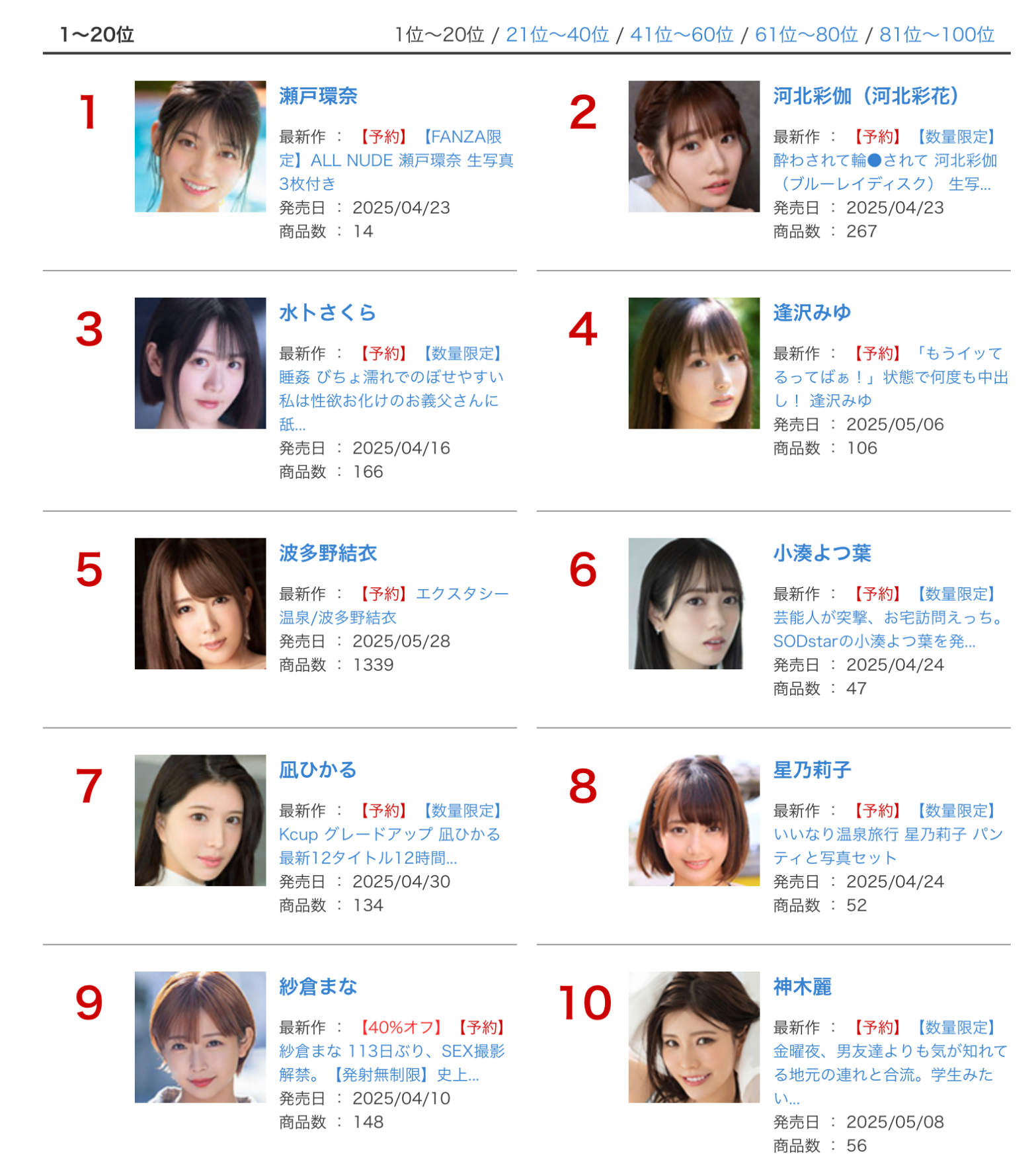 这次的冠亚军和之前有点不太一样,让瀬戸环奈拿下冠军的作品是她附赠拍立得的写真作品「ALL NUDE」」,她2泊3日的约会片「最强ヒロインの素颜とriaルセkkusが见たい!筋书きなしで性」欲のままに何度もずっと求め合うエロくて生々しい2泊3日SEXデート」只拿下第二个而且DVD版还跌到了第11名,虽然她还是巅峰巅峰非常强,继续在我们实体片的月间AV女优排行榜以及串流平台拿下作品销售冠军,不过可以观察一下这会不会是瀬戸环奈职业的转折: