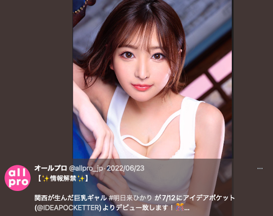 不过话说回来,明日来ひかり(明日来光)的情况蛮微妙的:透过事务所的官方twitter可以知道她是AllPro的人,但就仅限于此了,她和樱茉日一样是在官网找不到宣传卡的女优ー樱茉日的状况还好解释,因为她是OPPAI专属的新人,资料不需要给其他片商浏览,但明日来ひかり(明日来光)不是,用番号IPIT出道的她就是在大型片商出道完就离开的企划女优,为什么到现在还找不到资料真令人费解,如果不是继续在IP社发片,很有可能出道作发完就离开了⋯