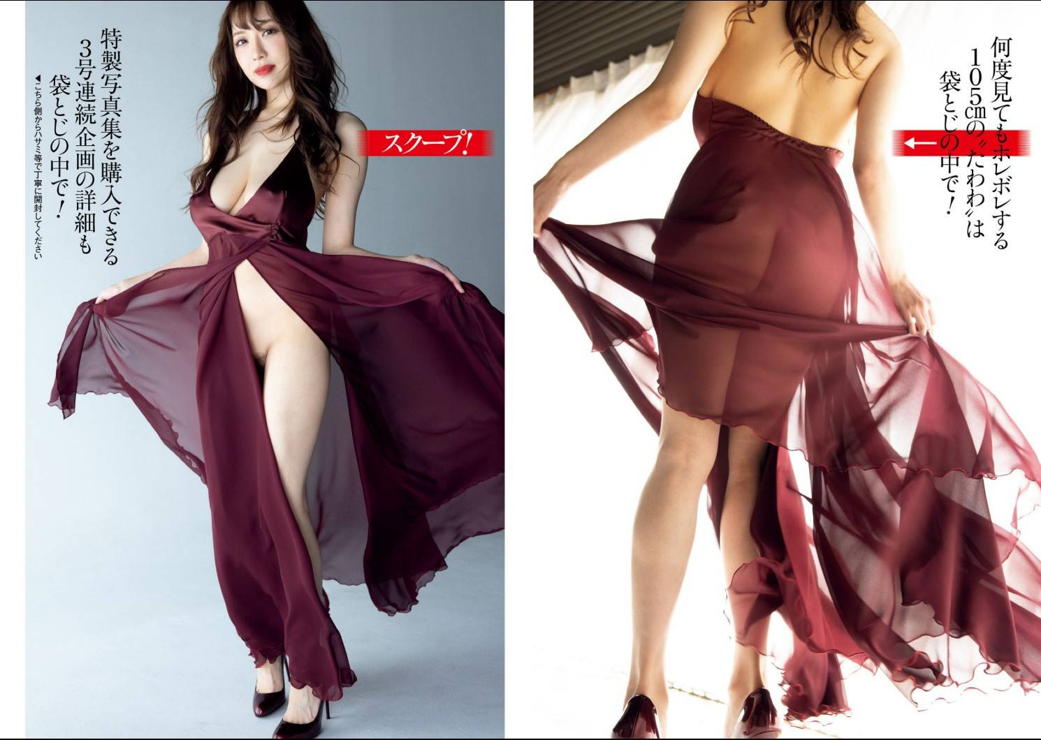 这是她为这本杂志拍摄的2023カレンダー(2023年月历),随书还附赠650×253mm的超大海报,想要收藏安斋的朋友一定要买下这本杂志;另外,请大家再看看封面的右上角,有没有另一个B105(胸围)的凪ひかる(凪光)?两位同样胸围壮观J罩杯的神乳在同一本杂志登场,除了显示8MAN这家经纪公司和周刊ポスト(周刊Post)关系真的很好,还有,这家事务所真的是好强,是超强的乳香世家啊〜