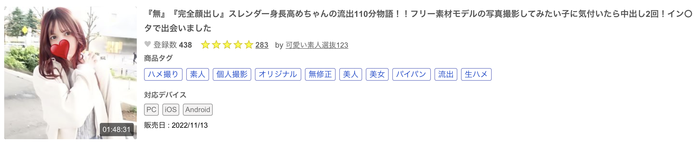 这是才刚发片的作品「『无』『完全颜出し』スレンダー身长高めちゃんの流出110分物语!!フリー素材モデルの写真撮影してみたい子に気付いたら中出し2回!イン〇タで出会いました」(FC2-PPV-3127344),卖家除了告诉我们演出的女优会露脸给你看外也提到她是个身材苗条高挑的模特儿,原本来拍写真的她很自然地和卖家发生了性关系,天干物燥不宜用套,两发都是中出!